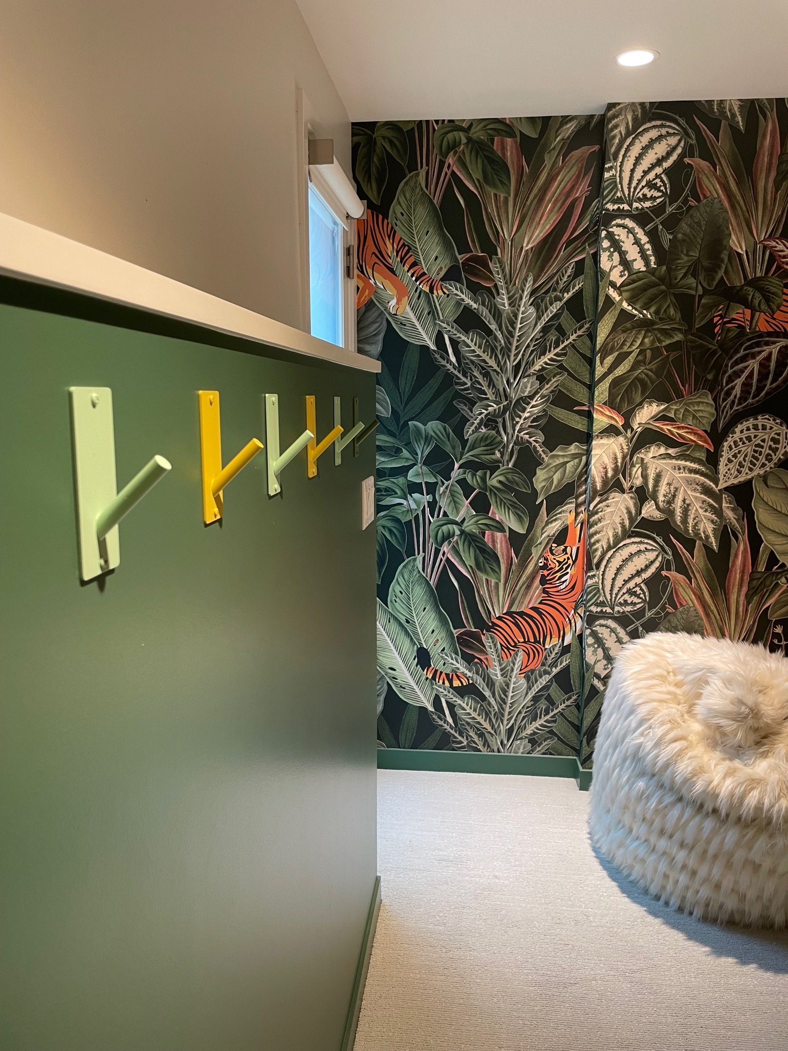 colorful playroom , paint, hooks, rugs and wallpaper selected by The Color Counsel